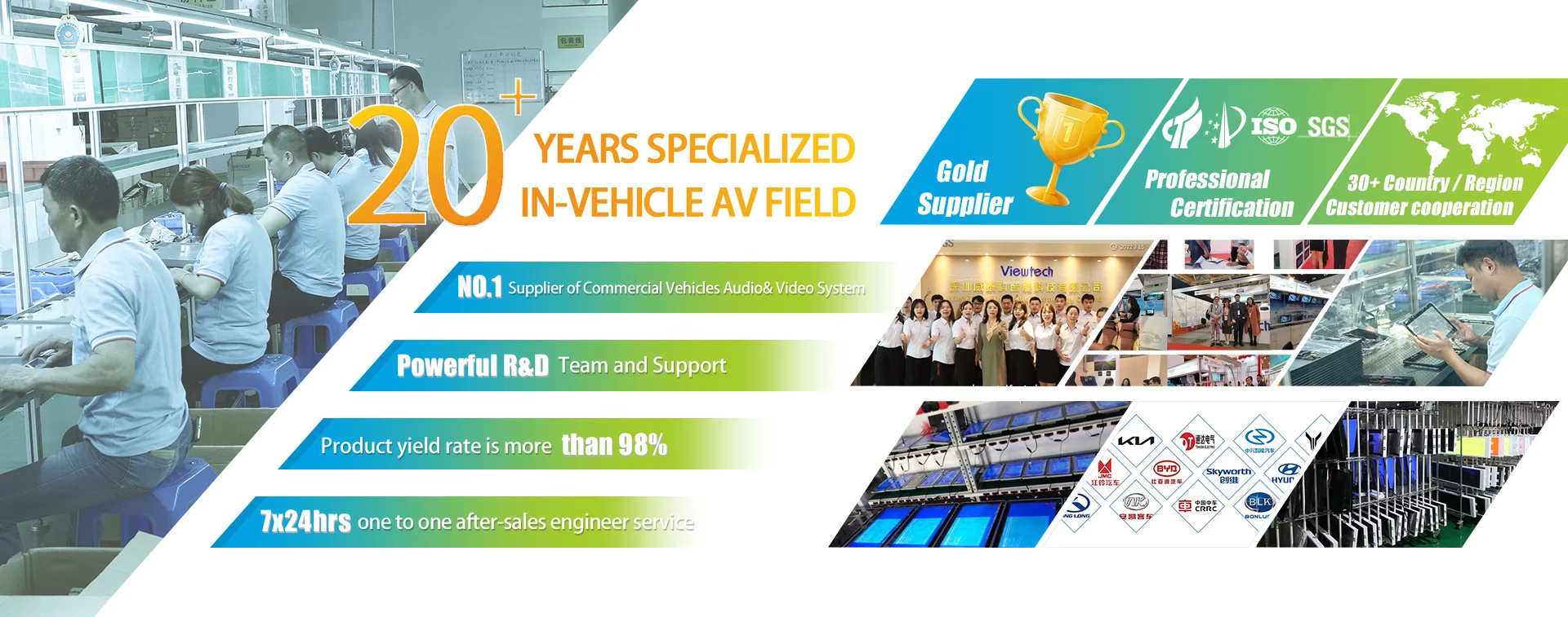 Shenzhen ViewTech Electronic Technology Co., Ltd has been specialized in Passenger Vehicle Audio Video Entertainment, Infotainment and Advertisement Player since 2005, mainly for Bus.Taxi. Coach. Caravan. Train. Ship. Car. Truck, etc . Products include monitor, advertising player, video on-demand (VOD) system, dvd player, rear seat entertainment system and safety security devices etc. We are committed to improving the passenger's travelling experience and adding value to the vehicles, help customers innovating new business mode & expand the market via our products and services.